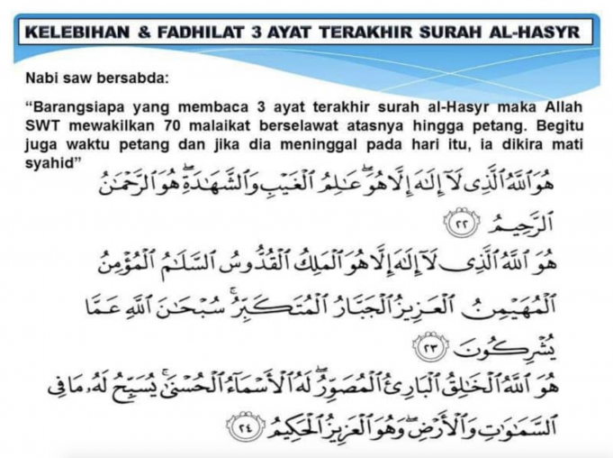 Home Pedoman Baca ayat ini malaikat berselawat ke atas anda dari pagi sampai petang. Pedoman Baca ayat ini malaikat berselawat ke atas anda dari pagi sampai petang. By Editor - March 30, 2020 1598 0 Share Facebook Twitter Pinterest WhatsApp Kelebihan & Fadhilat 3 ayat terakhir surah al-hasyr. RELATED ARTICLESMORE FROM AUTHOR Doa Untuk Amalan Orang Berumur 40 tahun Zikir Mohon Allah Bantu Dalam Semua Urusan Pahala dosa di Facebook (FB). Nak dapat pahala dan elak dosa, ini tipnya. Mengapa Kita Perlu Utamakan Keluarga dan Sayangi Adik-Beradik. Ayat Manzil Untuk Rawatan Pelbagai Gangguan, Sihir, Sedih, Hiba, Dukacita, Stress atau Tertekan. Zikir Asma Husna – Rahsia Seribu Kebaikan dan Penyelesai Pelbagai Masalah Dalam 99 Nama Allah LEAVE A REPLY Cancel reply Please enter your comment! Please enter your name here You have entered an incorrect email address! Please enter your email address here Save my name, email, and website in this browser for the next time I comment. Δ Umum94Acara79Makanan50Kesihatan37Reviu34Petua30